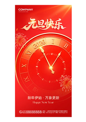 红金2026元旦快乐时钟新年伊始万象更新海报
