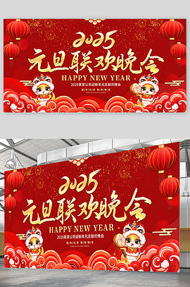红色大气2025蛇年元旦联欢晚会舞台背景宣传展板元旦晚会