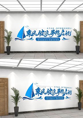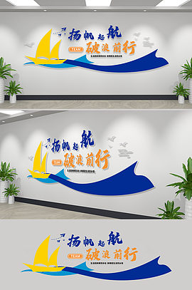 蓝色扬帆起航帆船造型企业励志标语文化墙企业文化墙